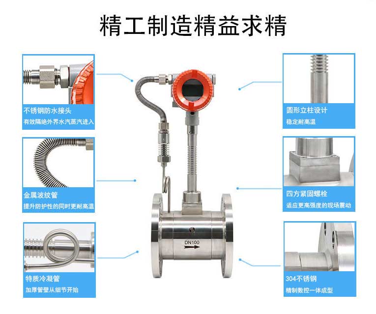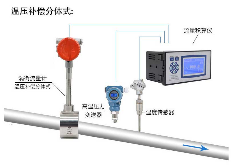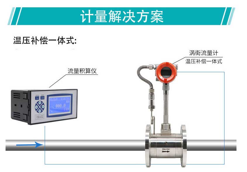2、溫度補償一體型還帶有溫度傳感器,可以直接測量出飽和蒸汽的溫度并計算出壓力,從而顯示飽和蒸汽的質量流量。