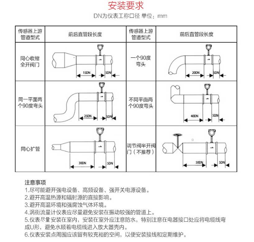 5、直管段要求:至少保證流量計前15倍管徑,流量計后5倍管徑。如流量計前有彎頭,縮進,擴大等干擾源,則需保證流量計前30-40倍的管徑,流量計后6倍管徑。流量計應安裝于調節閥,壓力或溫度傳感器的上游。