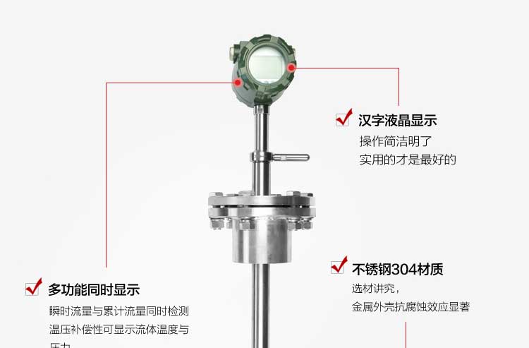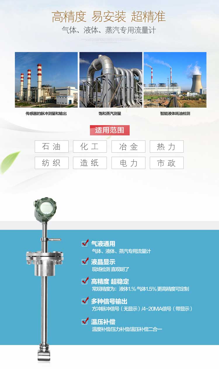 插入式渦街流量計**適用于石油、化工、冶金、熱力、紡織、造紙等行業對過熱蒸汽、飽和蒸汽、壓縮空氣和一般氣體(氧氣、氮氣氫氣、天然氣、煤氣等) 、水和液體(如:水、汽油、酒精、苯類等)的計量和控制。