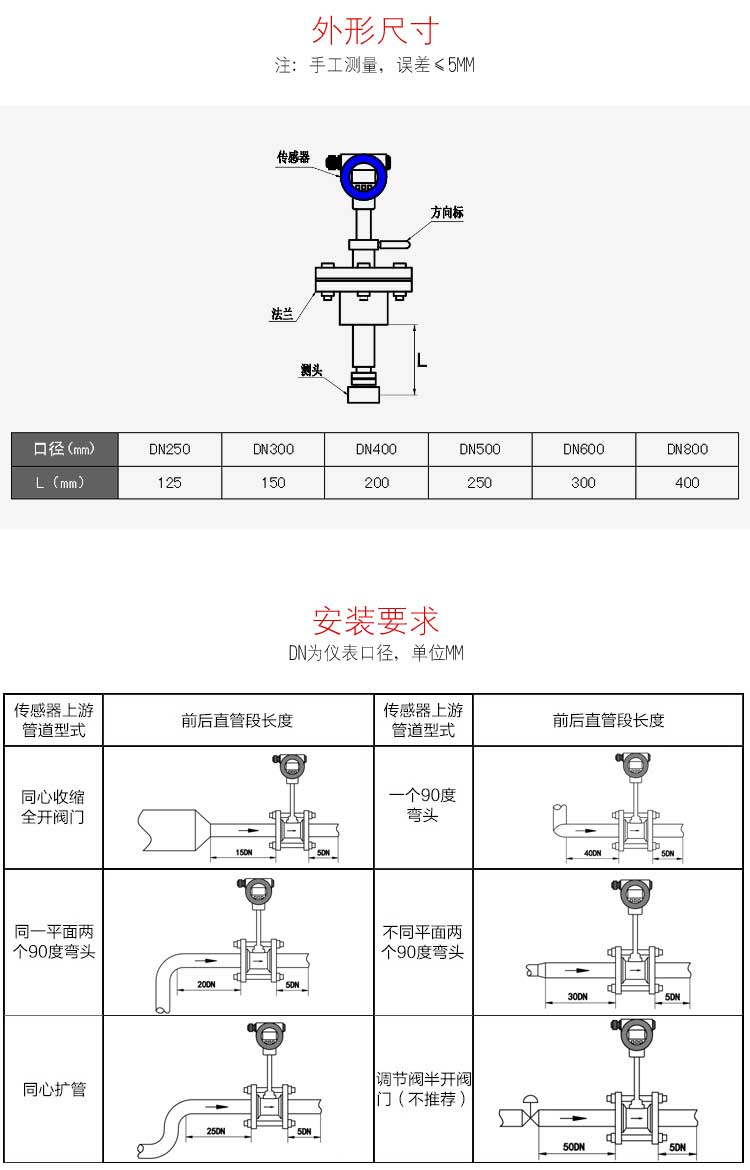 4.保證流量計前有大于15D和后有5D的直管段(D為管道內徑)。