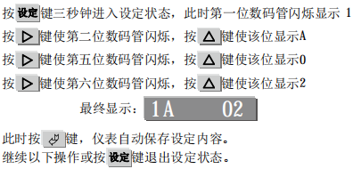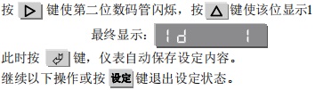 小數(shù)點位置的提示符是:d,在設(shè)定顯示范圍前,先設(shè)定小數(shù)點位置。小數(shù)點位置設(shè)定代碼范圍是0~3,其含義是0對應(yīng)個位〔第六位數(shù)碼管〕,1對應(yīng)十位〔第五位數(shù)碼管〕,2對應(yīng)百位〔第四位數(shù)碼管〕,3對應(yīng)千位〔第三位數(shù)碼管〕。從例二中我們看到顯示范圍是-100.0~100.0℃,小數(shù)點位置在十位上,也就是說在第五位數(shù)碼管上顯示,其對應(yīng)代碼是1。因此按以下操作進行小數(shù)點位置設(shè)定。
