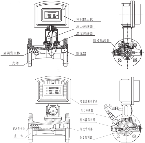 當沿著軸向流動的流體進入流量傳感器入口時,螺旋形葉片強迫流體進行旋轉運動,于是在旋渦發生體中 心產生旋渦流,旋渦流在文丘利管中旋進,到達收縮段突然節流使旋渦流加速,當旋渦流進擴散段后,因回流 作用強迫進行式二次旋轉。此時旋渦流的旋轉頻率與介質流速成正比,并為線性。兩個壓電傳感器檢測的微弱 電荷信號同時經前置放大器放大、濾波、整形后變成兩路頻率與流速成正比的脈沖信號,體積修正儀中的處理 電路對兩路的脈沖信號進行相位比較和判別,剔除干擾信號,而對正常的流量信號進行計數處理。