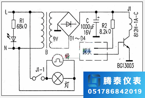 市電通過變壓器B與二次電源耦合。經過整流濾波后,電容器C兩端產生12V直流電壓。該電壓通過繼電器線圈施加到三極管集電極上