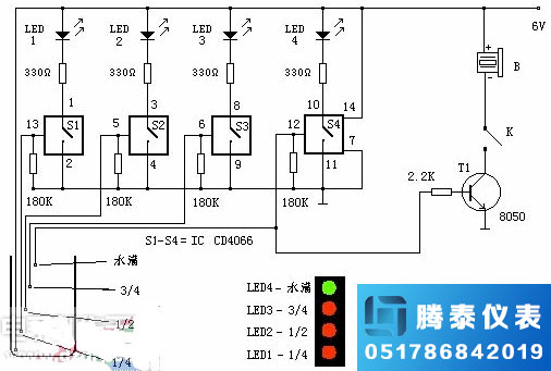 該電路由四路模擬開關IC CD4066組成。每個電路有四個獨立的開關,可以控制數字或模擬信號的傳輸。水箱無水時,由于180K電阻的作用,四個開關的控制端為低電平,開關為off,LED不亮