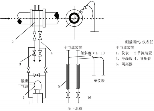 測量蒸汽流量時,安裝方式一般為差壓變送器低于、高于節流裝置兩種。取壓口位置應附合上述安裝要求,并在導壓管制高點處裝上放氣閥和氣體收集器。
