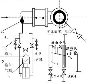 測量介質為清潔的氣體流量時,安裝方式一般為差壓變送器高于、低于節流裝置兩種取壓口位置應符合上述安裝要求,當差壓變送器低于節流 裝置時,導壓管必須向下彎至差壓變送器,并在*低處裝置放水閥和沉積器