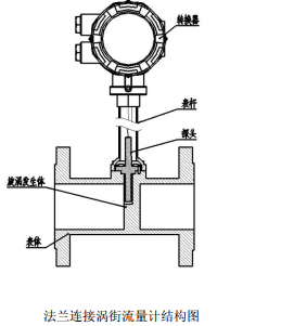 法蘭連接型渦街流量計的基本結構主要是由表體、探頭、旋渦發生體、表桿和轉換器等組成。
