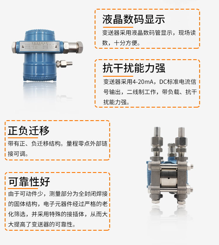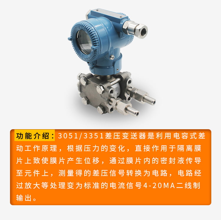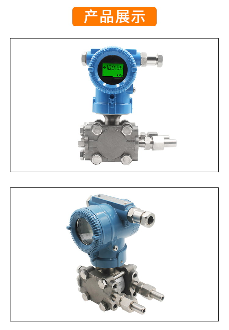 差壓變送器用于在高工作壓力環境下測量液體、氣體或蒸汽的液位、流量和壓力,然后轉變成4~20mA DC信號輸出。智能型可與HART手操器相互通訊,通過它進行設定,監控或與上位機組成現場監控系統。