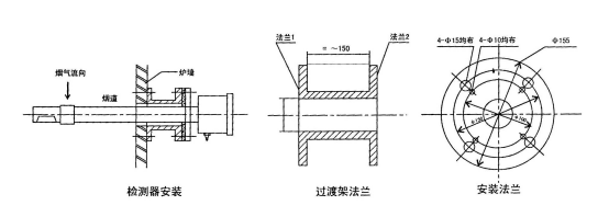 4、爐墻上的氧化鋯探頭固定法蘭裝置時,用鋼材做成如圖外形的過渡架,過渡架的法蘭能直接焊在爐墻處壁上或埋入爐墻中,但請求氣密結實。過渡架另一端法蘭是為固定氧化鋯探頭而設,因而必需與氧化鋯探頭固定法蘭的螺孔相匹配。如選用由12mm裝置孔,則將過渡架法蘭的¢125mm圓上均布四個¢12mm的裝置孔,運用4個M1O×40的螺絲,將它與檢測器的固定法蘭緊固,為避免漏氣,兩法蘭間可填充橡膠紙板密封圈。