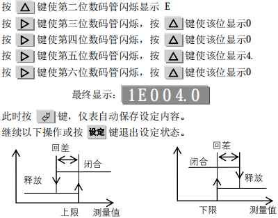 小長圖有紙記載儀上下限報警繼電器的觸點是給用戶聯接相應的控制電器[如電 磁閥]以組成控制系統時運用。為了避免在報警點左近繼電器觸點產生抖 動現象,儀表采用設定回差的辦法,以消弭繼電器觸點顫動。其提示符是:E